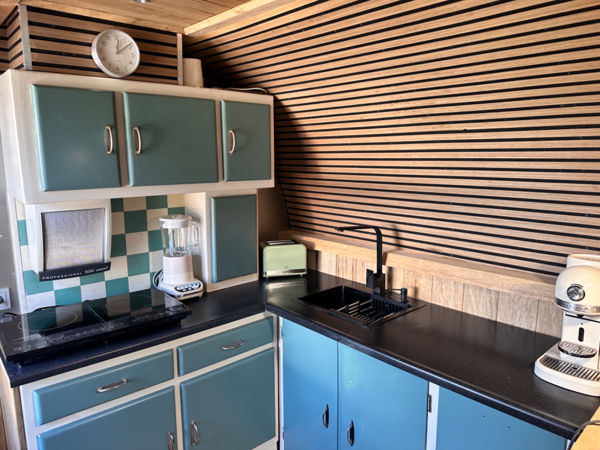 Volledig ingerichte jaren 1950 Bruynzeel retro keuken.